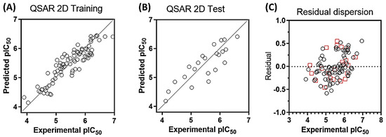 Plots of experimental versus predicted activity for the training set (A) and test set (B). Residual distribution plot (C). Black circles, training set, red squares, test set. All compounds are within a logarithmic unit of residual value (residual = pIC50 exp − pIC50 pred).