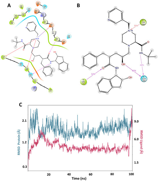 Molecular dynamics for the best docking pose of Indinavir in the active site predict over 35% of time interactions with Tyr268, Leu162, and Gln269 (Figure 4B). Additionally, the formation of a new interaction with a chiral OH of indinavir and Gln269 can be observed for 62% of the total simulation time. At the Y268 site, interactions between indinavir and the residues Asp164, Tyr268 and Gln269 are also observed. Additionally, Lys157 establishes a hydrogen bond interaction with an amide oxygen. The RMSD plot for the protein and the complex are shown in Figure 4C. The worst stabilization for Indinavir was at the H73 site. (See Supplementary Materials). Based on these results, it can be concluded that Indinavir is a good anti-SARS-CoV-2 candidate to be evaluated in vivo as a PLpro inhibitor, with a potential affinity for the C111 and Y268 active sites.