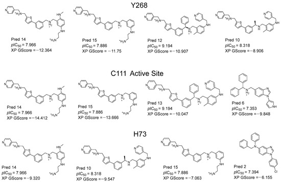 Structures of the best designed compounds and their predictive values of pIC50 according to the QSAR. The docking scoring values (XP GScore) of the best compounds in the three PLpro sites (Y268, C111 and H73) are also shown. Molecules are shown in the most favorable protonation state at pH 7.0.