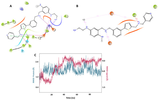 The Pred14 molecule stands out by having the best scoring in the Y268 and C111 binding sites (−12.364, −14.412 respectively). Pred14 also has the second better score in H73, close to the Pred10 value (−9.320 versus 9.547, respectively). Positively charged nitrogen atoms of Pred14 interact with Asp164 and Glu167 via hydrogen bond and ionic interactions, both at the active site (C111) and at the Y268 site (Figure 6A,B). In the docking of Pred14 with H73, only an ionic interaction with the Glu70 residue was observed. In molecular dynamics, RMSD analysis indicates that the complex stabilizes at both the active site (C111) and at Y268 allosteric site (Figure 6C), but stabilization was erratic at H73. As for the duration of the interactions, the lowest prevalence was with Leu162, with 35% of the duration of the interaction in the active site. In this site also, the prevalence of 96% of the terminal amine protonated with the amino acid Asp302 stands out, while in H73 no significant interactions are observed. The second compound, PRED15, presented good scoring in the active site (−13.666) and the Y268 site (−11.750), and showed stable dynamics over time, making it the second compound with the highest PLpro inhibitor potential.
