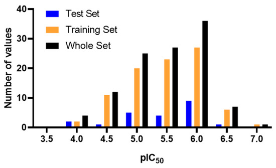 A matrix of pIC50 values (dependent variable) and descriptors (independent variables) was constructed. A PLS statistical regression was then performed in Minitab, and 29 compounds with high residual value (residuals greater than 0.5 log units) were discarded. The final model was built with 113 molecules, of which 90 were used as training set (79.6%) and 23 as test set (20.4%). The distribution of the biological activity values for training, test and the complete set is presented in the Figure 7. The final model was built using the following 13 descriptors: ALogP (lipophilicity), ALogP2, AMR (molar refractivity), DPSA-3 (Di-polarity/polarizability, Size and Shape, and Atom-type counts descriptor), nAr (number of aromatic rings), nBasic (number of basic nitrogen atoms), nAcid (number of carboxylic acids), nF (number of fluorine atoms), nCl (number of chlorine atoms), nHBDon (number of hydrogen bond donor atoms), nO (number of oxygen atoms), TopoPSA (topological polar surface area) and VABC (van der Waals volume with Atomic and Bond Contributions). Finally, we proceeded to execute the statistical validations of the model by calculating r2test, r2rand-test, q2F1, q2F2, q2F3, CCC, MAE and Y-random test.
