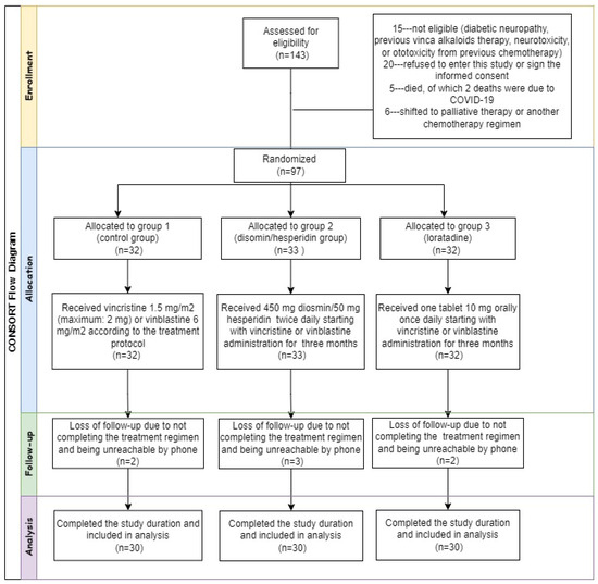 Patients who met the eligibility criteria were randomly assigned to one of three groups. The randomization list was generated utilizing the website http://www.jerrydallal.com/random/random_block_size_r.htm accessed on 15 October 2021. Group 1 (control group) received VCR 1.5 mg/m2 (maximum: 2 mg) or VBL 6 mg/m2 (maximum 10 mg) according to the treatment protocol. Group 2 (diosmin/hesperidin group) received one film-coated tablet of 450 diosmin and 50 mg hesperidin micronized purified flavonoid fraction (MPFF) combination orally twice daily starting with VCR or VBL administration and continued for a three-month duration [75]. Group 3 (loratadine group) received one tablet of 10 mg loratadine orally once daily starting with VCR or VBL administration and continued for a three-month duration [28].