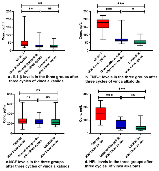 The three groups showed no statistically significant difference in the baseline levels of IL1-β, TNF-α, NGF, and NFL, as shown in Table 4. There was a significant increase in IL1-β, TNF-α, and NFL levels in the three groups, but loratadine and diosmin/hesperidin-treated patients showed lower levels of these biomarkers compared with the control group, as shown in Figure 2a,b,d. On the other hand, NGF did not change significantly from baseline, as shown in Table 4, and showed comparable levels in the three groups after treatment, as demonstrated in Figure 2c. Within the three groups, the levels of neurotoxicity biomarkers increased in the three groups, although this rise was smaller in both groups 2 and 3 compared with group 1.