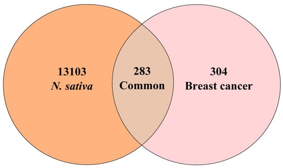 Human genes linked with the pathology of breast cancer were sourced from the GeneCard [46] and DisGeNET databases [47]. These target genes were compared to UniProtKB IDs to eliminate redundancies. The Jvenn plug-in was used to obtain a Venn diagram [48] to identify the shared genes from targets related to N. sativa and breast cancer.