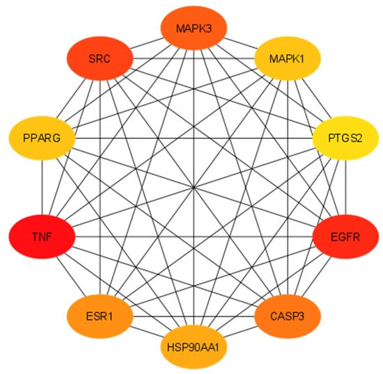 Top 10 hub genes as targets of N. sativa on breast cancer analyzed by Cytoscape.