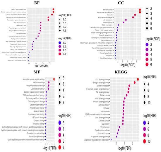 The bubble plot representation of the functional annotation and the enriched pathways in relation to breast cancer. (BP) GO with reference to biological processes, (CC) gene ontology with reference to cellular components, (MF) gene ontology with reference to molecular function, and KEGG pathway analysis.