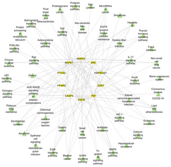 The C–T–P network was constructed using Cytoscape 3.9.1 by integrating compound–target and target–pathway networks. This integrated network facilitates understanding of the interconnections between each gene and its significant pathways, which play roles in specific cascades related to biological and cellular signaling. Using this network, we aim to identify the most relevant targets for active components relevant to breast carcinoma.