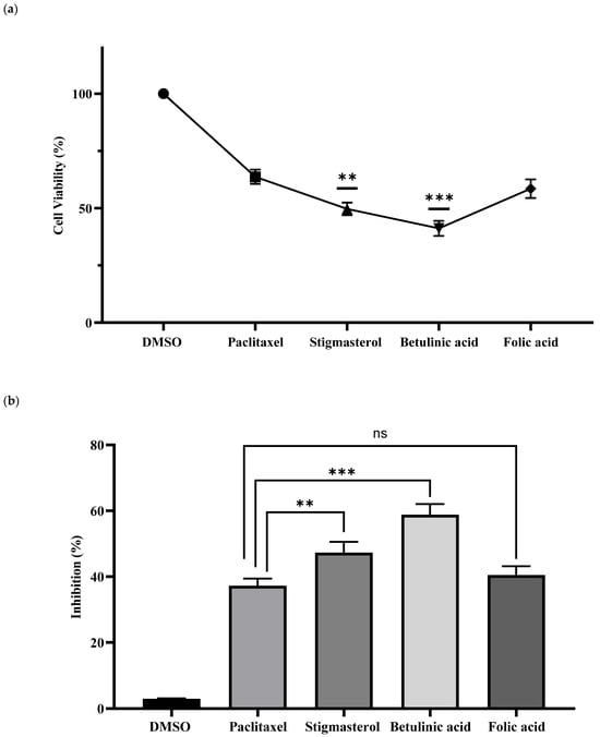 Cytotoxic activity of the best phytochemicals (i.e., folic acid, betulinic acid, and stigmasterol at concentrations of 200 µg/mL). (a) MTT assay for cytotoxicity analysis. The analysis was carried out in triplicate and the values are taken as mean ± standard error of the mean (SEM). (b) percentage of cell viability. The results are considered statistically very significant compared to the standard drug if the p-value was <0.01 and represented by ‘**’. When the p-value was found to be <0.001, it is considered highly significant compared to the standard drug and is represented by ‘***’. Values are shown as mean ± SEM for the representation of data. ns: nonsignificant.
