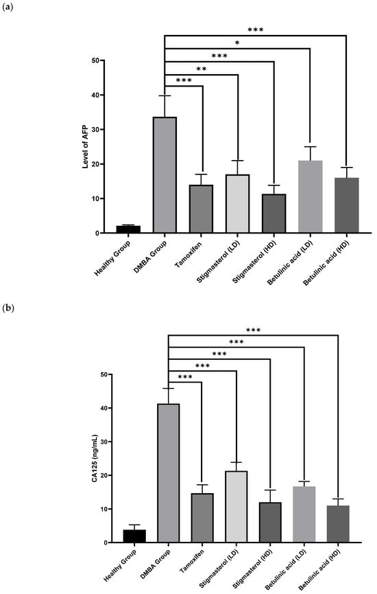 Effect of stigmasterol, betulinic acid, and standard drug on tumor markers. (a) The AFP values increased significantly in the DMBA group but recovered in the treatment groups. (b) The CA125 measurements. The results are considered statistically significant compared to the DMBA group if the p-value was <0.05, which is represented by ‘*’, if the p-value was <0.01 and represented by ‘**’. The standard drug tamoxifen (p < 0.001 ***), stigmasterol with low dose (LD) (p < 0.001 ***), stigmasterol high dose (HD) (p < 0.001 ***), betulinic acid low dose (LD) (p < 0.001 ***), and betulinic acid high dose (HD) (p < 0.001 ***) showed statistically highly significant results compared to the DMBA group.