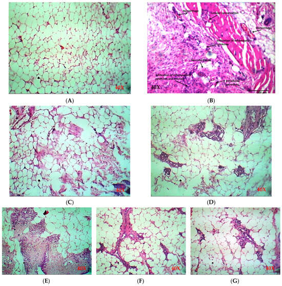 Histopathology of breast tissues. (A) mammary section of the healthy group (Group 1) showing no change in breast tissue, (B) mammary section of the DMBA group (Group 2), in which necrosis, hemorrhage, intraductal secretions, inflammation, and lobular cancerization were observed, (C) standard drug treatment (tamoxifen) (Group 3) showing significant improvement in breast tissue, (D) stigmasterol low dose group (Group 4) showing no inflammation, necrosis, or hemorrhage, (E) stigmasterol high-dose group (Group 5) showing improvement in breast tissue, (F) low-dose betulinic acid group (Group 6) representing no ductal secretions, inflammation, or necrosis, (G) high-dose betulinic acid group displaying significant improvement in breast tissue without evidence of cancer.