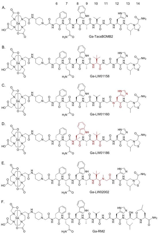 Chemical structures of (A) Ga-TacsBOMB2, (B) Ga-LW01158, (C) Ga-LW01160, (D) Ga-LW01186, (E) Ga-LW02002, and (F) Ga-RM2. The unnatural amino acid substitutions in Ga-TacsBOMB2 derivatives are shown in brown.