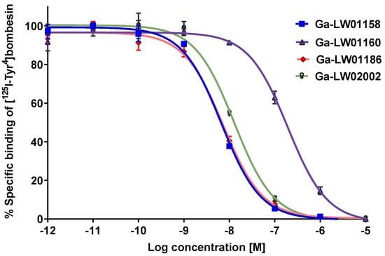 Displacement curves of [125I-Tyr4]Bombesin caused by Ga-LW01158, Ga-LW01160, Ga-LW01186, and Ga-LW02002 generated using GRPR-expressing PC-3 cells. Error bars indicate standard deviation.