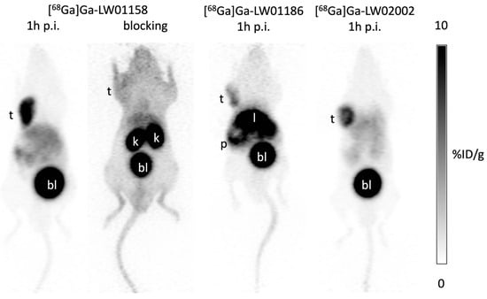 Representative PET images of [68Ga]Ga-LW01158, [68Ga]Ga-LW01186, and [68Ga]Ga-LW02002 acquired at 1 h post-injection in mice bearing PC-3 tumor xenografts. t: tumor; k: kidney; p: pancreas; l: liver; bl: urinary bladder.