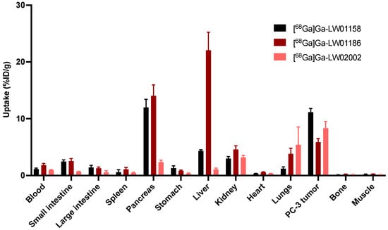 Uptake of [68Ga]Ga-LW01158, [68Ga]Ga-LW01186, and [68Ga]Ga-LW02002 in PC-3 tumor xenografts and major organs/tissues of NRG mice at 1 h post-injection (n = 4). Error bars indicate standard deviation.