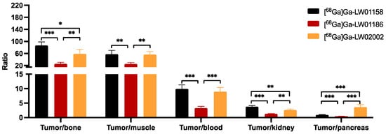 Tumor-to-organ uptake ratios of [68Ga]Ga-LW01158, [68Ga]Ga-LW01186, and [68Ga]Ga-02002 obtained from PC-3 tumor-bearing mice at 1 h post-injection (n = 4). Error bars indicate standard deviation. * p < 0.05; ** p < 0.01; *** p < 0.001.