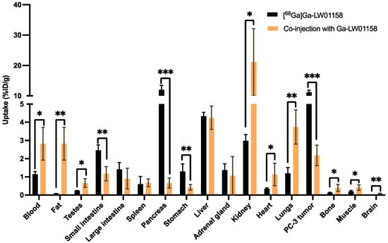 Comparison of the uptakes of [68Ga]Ga-LW01158 with/without co-injection of 100 µg of nonradioactive Ga-LW01158 in PC-3 tumor xenografts and major organs/tissues in mice at 1 h post-injection. Error bars indicate standard deviation (n = 4). * p < 0.05; ** p < 0.01; *** p <0.001.