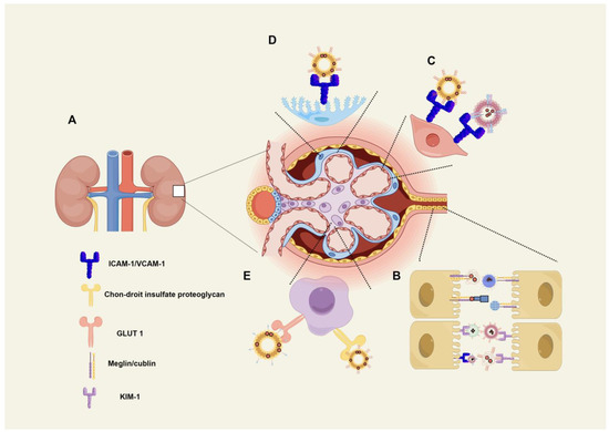 Drugs absorbed via different receptors: (A) the structure of the glomeruli in the kidneys is shown; (B) nanocomplex absorbed via VCAM-1, ICAM-1, megalin/cubilin, and the KIM-1 receptor in renal tubular epithelial cells; (C) nanocomplex absorbed via VCAM-1 receptors in endothelial cells; (D) nanocomplex absorbed via VCAM-1 receptors in podocytes.; and (E) nanocomplexes absorbed by GLUT1 and chondroitin sulfate proteoglycan receptors in mesangial cells. Abbreviations: ICAM-1: intercellular adhesion molecule-1; VCAM-1: vascular cell adhesion molecule-1. The figure was drawn by Figdraw (www.figdraw.com), accessed on 25 April 2024.