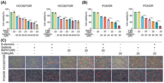 In recent years, numerous pharmacological studies have explored the use of autophagy inhibitors as a therapeutic strategy for cancer [40,41]. Most of these studies have demonstrated that inhibiting autophagy can sensitize cancer cells to chemotherapy-induced cell death. This finding is supported by our observation that the co-administration of autophagy inhibitors, including BaFA1 and 3-MA, significantly amplifies apoptosis in resistant cells when used together with gefitinib. Interestingly, β-elemene, when used in conjunction with gefitinib, mirrors the effects of these autophagy inhibitors, suggesting its potential role as an autophagy modulator.