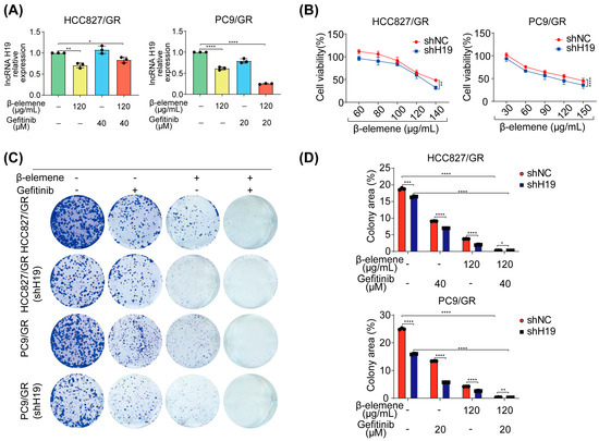 The extensive investigation conducted in this study aimed to assess the impact of β-elemene on the expression of lncRNA H19, autophagic mechanisms, and its potential role in overcoming gefitinib resistance in lung cancer cells. We administered β-elemene alone or in combination with gefitinib to HCC827/GR and PC9/GR cells, resulting in a significant decrease in the expression of lncRNA H19 in the resistant cell lines (Figure 5A). To elucidate the functional role of long noncoding RNA (lncRNA) H19 in β-elemene treatment, we employed knockdown strategies to silence lncRNA H19 in drug-resistant strains. Remarkably, our findings demonstrate that silencing lncRNA H19 significantly enhances cellular sensitivity towards β-elemene (Figure 5B). Furthermore, the suppression of lncRNA H19 substantially impedes post-treatment colonization ability of cells, irrespective of single or combination drug administration (Figure 5C,D).
