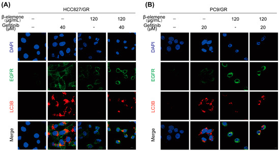 To assess autophagic flux, HCC827/GR and PC9/GR cells were transfected with the GFP-RFP-LC3 plasmid using Lipofectamine 2000 as per the manufacturer’s instructions. Following treatment with β-elemene and gefitinib, fluorescent images were captured using a confocal laser scanning microscope (model #FV3000RS, Olympus, Tokyo, Japan). Autophagic flux was evaluated based on the presence of yellow and red puncta [10].