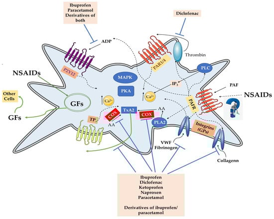The thrombo-inflammatory signaling of platelet activation and the modulatory effects of each and all NSAIDs on each platelet agonist and its associated receptors. ADP activates the P2Ys receptors’ associated signaling; AA and COX produce TxA2 that activates TP receptors’ signaling; vWF, fibrinogen and Collagen activate GPs (integrins) associated signaling; Thrombin activates PARs receptors’ signaling; PAF activates PAFR signaling that affects all the other platelet agonists’ signaling (i.e., activation of PLC for IP3 production, activation of kinases, activation of PLA2 for production of AA, etc.). Activation of each platelet agonist-receptor signaling results in processes through activation of intracellular signaling by kinases (MAPK, PKA, PKC, PIP3K, etc.), IP3 and [Ca+2i], AA, GFs, etc., all of which result in activation and aggregation of platelets. Each NSAID and some of their derivatives were found to modulate several of these thrombo-inflammatory signaling, apart from the PAF/PAFR pathways for which limited information exists. NSAIDs also affect the release of several agents and factors from platelet granules, such as GFs. Abbreviations: NSAID(s) = non-steroidal anti-inflammatory drug(s); AA = arachidonic acid; ADP = adenosine 5′ diphosphate; TP = Thromboxane Prostanoidreceptors; P2Ys = metabotropic P2 receptors, such as the Gq-protein-coupled P2Y1 and the Gi-protein-coupled P2Y12 receptor; PARs = protease-activated receptors (mostly PAR1 and PAR4); TxA2 = thromboxane A2; TxB2 = thromboxane B2; COXs = cyclooxygenases; GPs = glycoproteins as receptors (integrins), such as the integrin αIIbβ3 (glycoprotein GPIIbIIIa), integrin α2β1 (glycoprotein GPIa-IIa) and glycoprotein VI (GPVI); PAF platelet-activating factor; PAFR = receptor of PAF; vWF = von Willebrand factor; GFs = growth factors (i.e., GFsNGF = nerve growth factor; BDNF = brain-derived neurotrophic factor); PLA2 = phospholipase A2; PLC = phospholipase C.