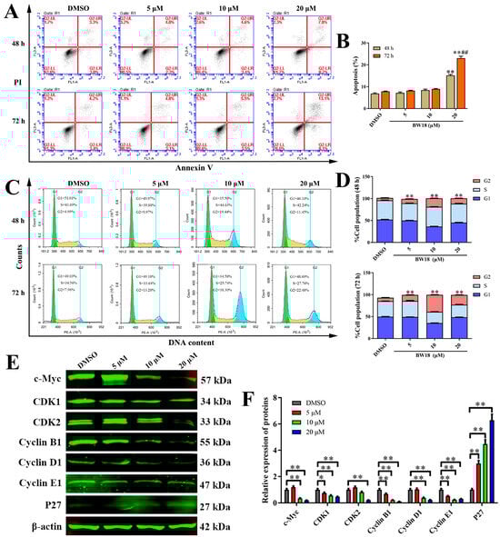 To elucidate the anti-proliferative mechanism of BW18 against HEL cells, the apoptosis and cell cycle progression of BW18-treated HEL cells were analyzed by flow cytometry. After 48 h treatment with different concentrations of BW18 (5, 10 and 20 µM), we observed that only high-concentration BW18 (20 µM) could induce remarkable apoptosis, compared with the control group. The apoptotic cells increased from 6.87% ± 0.55% (DMSO) to 15.17% ± 0.76% (20 µM). The trend of apoptosis rate of BW18-treated HEL cells for 72 h was consistent with that of 48 h, but the apoptosis rate of 72 h was higher than that of 48 h (Figure 2A,B).
