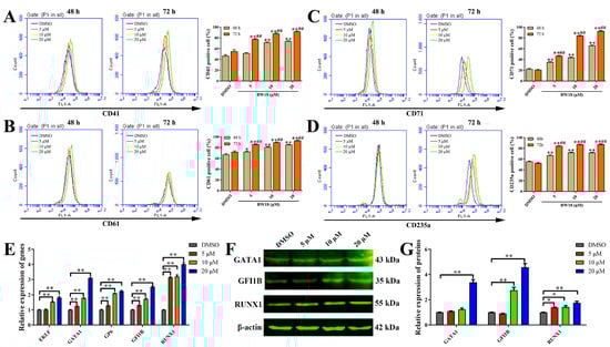 BW18 induced megakaryocytic and erythroid differentiation in HEL cells. (A–D) Treatment of HEL cells with various concentrations of BW18 increased the percentage of CD41+ cells (A), CD61+ cells (B), CD71+ cells (C) and CD235a+ cells (D), both 48 h and 72 h post-treatment. (E–G) Effects of BW18 on the expression of erythroid differentiation and megakaryocytic differentiation gene in HEL cells. (E) mRNA level and (F,G) protein level. All data are expressed as the mean ± SD. β-actin was used as the loading control. Each experiment was repeated in triplicate. * p < 0.05, and ** p < 0.01 vs. the control group. ## p < 0.01 vs. BW18-48 h group.