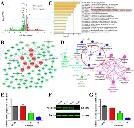PDGFRB was identified as an important downstream target gene of BW18. (A) Volcano plot shows the DEGs between HEL cells treated with and without BW18. Red dots represent up-regulated genes, green dots represented down-regulated genes and grey dots represented unchanged genes. DEGs were identified according to the following criteria: |log2 (fold change)| ≥ 1 and FDR < 0.0001. (B) PPI network of 184 BW18-related DEGs. Red represents hub genes. (C) Top 20 clusters of enrichment analysis of 184 BW18-related DEGs from Metascape. (D) Using ClueGO analysis of 184 BW18-related DEGs, 15 signaling pathways were significantly enriched (p < 0.05). (E–G) Effects of BW18 on expression of PDGFRB in HEL cells. (E) mRNA level. (F,G) Protein level. All data are expressed as the mean ± SD. β-actin was used as the loading control. Each experiment was repeated in triplicate. * p < 0.05, and ** p < 0.01 vs. the control group.