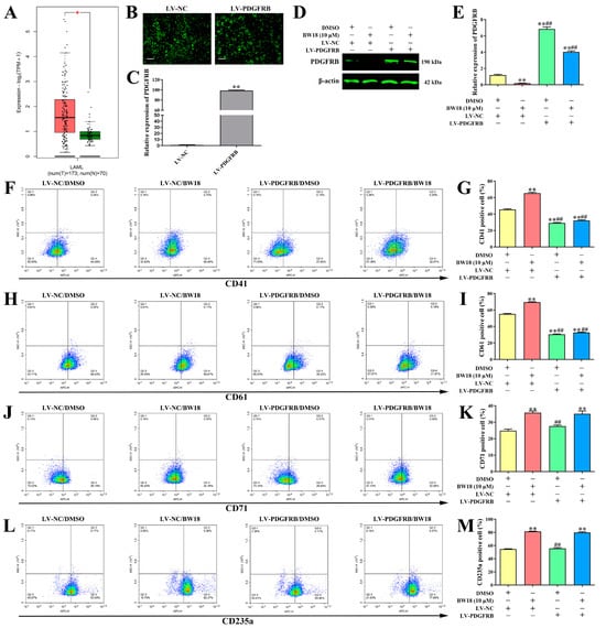 Overexpression of PDGFRB reversed BW18-induced megakaryocytic differentiation in HEL cells. (A) The expression level of PDGFRB in AML patients and normal from GEPIA database. (B,C) HEL cells were infected with lentiviruses expressing LV-PDGFRB or LV-NC and the overexpression efficiency was then validated by fluorescence microscopy (B) and qRT-PCR (C). (D,E) The expression level of PDGFRB, which was suppressed by BW18, was rescued by overexpression of PDGFRB. (F–I) Moreover, the increase in CD41 (F,G)/CD61 (H,I) levels induced by BW18 was completely diminished via PDGFRB overexpression. (J–M) Overexpression of PDGFRB can’t reverse BW18-mediated up-regulation of CD71 (J,K)/CD235a (L,M) levels. All data are expressed as the mean ± SD. β-actin was used as loading control. Each experiment was repeated in triplicate. **p < 0.01 vs. LV-NC/DMSO group. ## p < 0.01 vs. LV-NC/BW18-10 μM group.