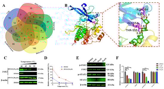 BW18 inactivated JAK2/STAT3 signaling pathway in HEL cells. (A) Venn diagram identified JAK2 as the target gene of BW18 in AML by intersecting the predicted targets of BW18 with the targets of AML from different databases. (B) AutoDockTools-1.5.6 was used to predict the molecular docking models of BW18 with JAK2. (C) CETSA was performed to test the interactions of BW18 and JAK2. (D) The graph showed the quantification of JAK2 protein versus temperature points based on Western blot analyses. (E) HEL cells were treated with BW18 at the indicated doses for 24 h. The expression levels of p-JAK2, JAK2, p-STAT3 and STAT3 were analyzed by Western blot. (F) Densitometry analysis of p-JAK2, JAK2, p-STAT3 and STAT3. All data are expressed as the mean ± SD. β-actin was used as the loading control. Each experiment was repeated in triplicate. ** p < 0.01 vs. the control group.
