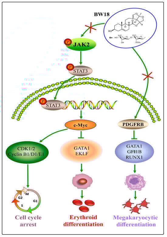 In the meantime, our data highlighted BW18 as a novel bidirectional differentiation inducer of erythroleukemia cells to undergo both megakaryocytic and erythroid differentiation. These beneficial effects can be explained by the BW18-mediated inactivation of PDGFRB and JAK2/STAT3 pathway in erythroleukemia cells. Therefore, our research provided a potential lead compound for erythroleukemia differentiation treatment (Figure 7). In the future, efforts to improve the druggability of BW18 are of great significance by chemical structural modification and optimizing drug delivery system. Further investigations are also needed to figure out the mechanism of PDGFRB-mediated megakaryocytic differentiation.