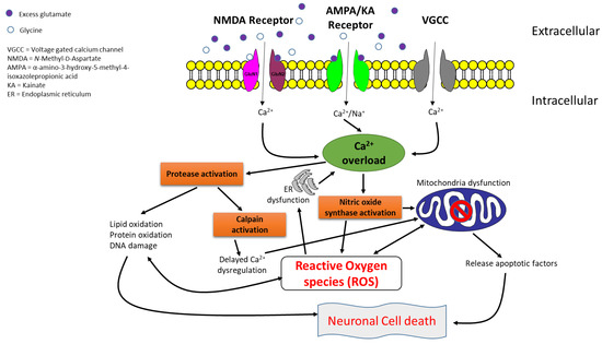 - Neves, D.; Salazar, I.L.; Almeida, R.D.; Silva, R.M. Molecular Mechanisms of Ischemia and Glutamate Excitotoxicity. Life Sci. 2023, 328, 121814. [Google Scholar] [CrossRef]