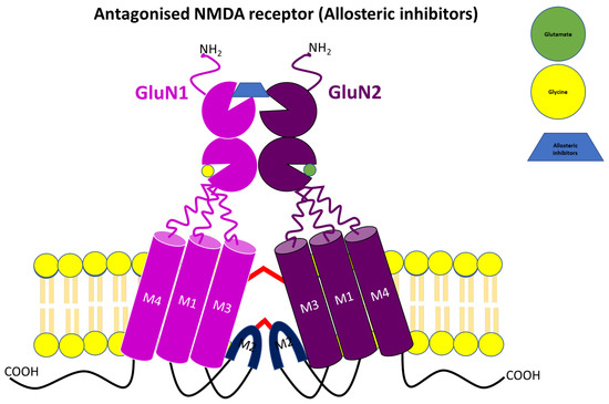 - Gibb, A.J. Allosteric Antagonist Action at Triheteromeric NMDA Receptors. Neuropharmacology 2022, 202, 108861. [Google Scholar] [CrossRef]