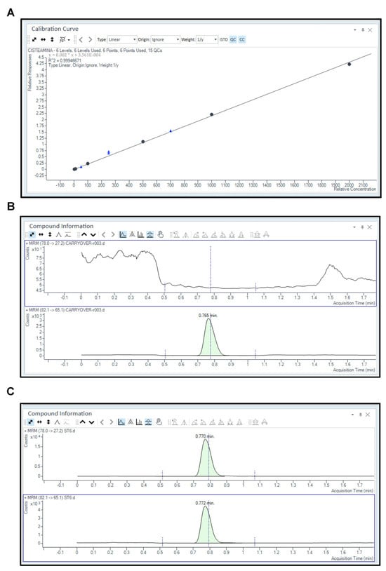Chromatograms obtained for cysteamine. (A) Six-point calibration curve for cysteamine. The calibration curve equation and R2 value are displayed in the inset. Blue triangles indicate L-QC, M-QC, and H-QC samples. (B) Chromatograms of blank plasma sample spiked with deuterated IS. (C) Chromatograms of plasma calibration point 6 (ST6). For each chromatogram, the upper and lower layers indicate the fragments used as the quantifier and the internal standard compound, respectively. The relative response (counts) from the baseline and the acquisition time (min) are reported on the y- and x-axes, respectively. For each peak, the retention time is displayed.