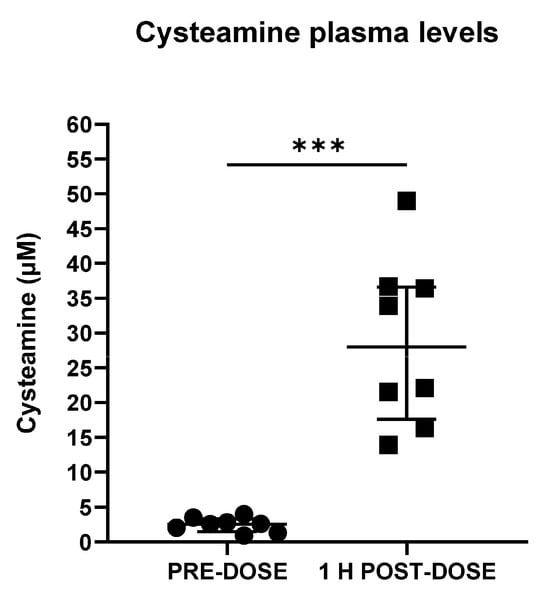 Cysteamine plasma levels. Box plots of cysteamine plasma levels measured in n = 8 cystinosis patients before (pre-dose) and 1 h after (post-dose) single-dose oral administration. Medians and interquartile range (IQRs) are displayed. *** p < 0.001 vs. pre-dose.