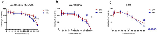 The impact of three of the analyzed compounds on the LoVo cell line is presented in Figure 1a–c. In all cases, decreasing cell viability was observed with the increasing drug concentration. Fe(III)–citrate revealed a significant reduction in mitochondrial activity for the 750 and 1000 μM concentrations, and Fe(III)–EDTA reduced the viability starting from 500 μM. Although a similar pattern was observed after 5-FU treatment, the cytotoxic concentrations were about 25-fold lower than for the Fe(III) compound. A notable viability reduction was observed from the 10 μM concentration and was statistically significant in the case of 50 μM. In the case of longer exposure (48 h), only a slight decrease in cell viability was observed in each case.