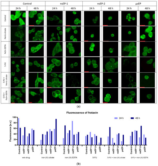 The increase in the incubation time after sub-microsecond ECT led to an increase in the frataxin signal (Figure 5b), whereas, in the case of the microsecond protocol, an increase was not observed. At 24 h incubation after nsEP-1, the expression of frataxin increased among all used drugs. However, the highest expression level was observed when 5-FU was combined with iron (III)–EDTA. With the elongated incubation time, the cells treated with 5-FU showed decreased frataxin expression, and the others increased. Concerning nsEP-2 therapy, the iron (III)–EDTA-treated cells revealed the highest frataxin expression, which diminished over time. In comparison, when combining iron (III)–EDTA with 5-FU, the expression was delayed, and the highest expression occurred after 48 h of incubation. Analyzing the µsEP therapy, 5-FU decreased frataxin’s expression and the effect diminished with an elongated incubation time.