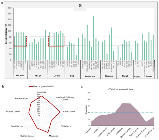Dynamics of compound 5l on 60 cancer cell lines from 9 different cancer panels. (a) % growth inhibition exerted by compound 5l at 10 µM concentration over NCI-60 cancer cell lines. Red squares indicate the highest number of consistent inhibitory activity. (b) Radar representation of the inhibitory activity of compound 5l on nine types of cancers. The red line is shaped in relation to increasing activity outward from the radar center. (c) Variations in 5l inhibitory effect among cell lines in each panel of cancer in NCI-60. The turquoise line shows 20% as the threshold.