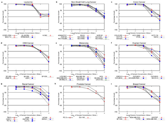 Five dose (0.01 to 100 μM) assay with compound 5l against NCI-60 cell lines. Cells were treated with five different doses of 5l for 48 h. Charts represent percentage growth between −100 and 100. Each cell line is indicated with different shapes and colors under the corresponding cancer chart. (a) Leukemia; (b) Non-small cell lung cancer; (c) Colon cancer; (d) CNS (central nervous system) cancer; (e) Melanoma; (f) Ovarian cancer; (g) Renal cancer; (h) Prostate cancer; (i) Breast cancer.