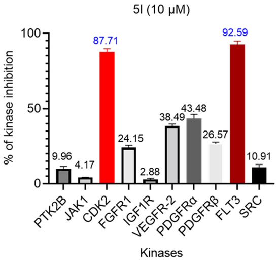 The percentage of inhibition of the target compound 5l (10 µM) was tested, versus a panel of ten kinases representing various signaling cascades including PTK2B, JAK1, CDK2, FGFR1, IGF1R, VEDFR-2, PDGFRα, PDGFRβ, FLT3, and SRC kinases, according to Z’-LYTE® technology for all kinases, except where the VEGFR-2, VEGFR-2/KDR ELISA kit is used (Figure 4).