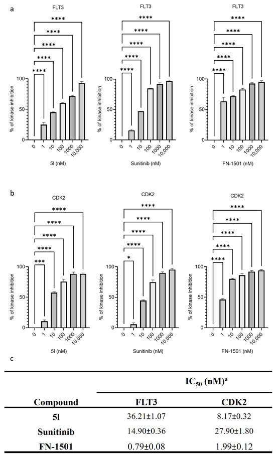 Dose titrations of 5l compared to sunitinib and FN-1501 against (a) FLT3 and (b) CDK2 kinases from 1 to 10,000 nM. (c) The half maximal inhibitory concentration (IC50) of compound 5l against FLT3 and CDK2 kinase activity compared to sunitinib and FN-1501. a IC50 values are of three separate experiments ± SD. * p ≤ 0.05, *** p ≤ 0.001, **** p ≤ 0.0001.