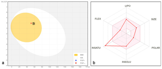 ADME estimation of active compound 5l. (a) The BOILED-Egg plot showcases the predicted GI absorption and BBB permeability for 5l, aligning with non-P-glycoprotein substrate characteristics (PGP−), and (b) the bioavailability radar chart, with the pink area depicting the optimal property values and the red lines representing the properties of 5l, which largely fall within the desirable range, indicating good oral bioavailability.