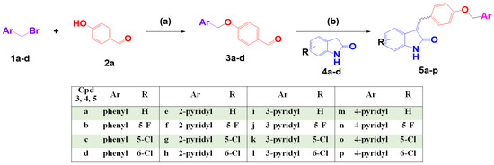 Synthetic approach of compounds 5a–p. Reagents and conditions: (a) K2CO3, ACN, reflux, 2 h; (b) Piperidine, EtOH, reflux, 5 h.