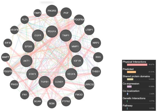 A total of 96 out of 695 keloid-related target proteins were identified after combining the 2 databases. The 96 genes were then imported into Cytoscape 3.9.1 to plot the keloid-related target network diagram. A total of 96 nodes and 100 edges were obtained using the Cytoscape 3.9.1 platform, with a high confidence score (0.98). The top 11 of the 96 targets were selected based on the degree, betweenness centrality (BC), and closeness centrality (CC) score (Table 2). The keloid-related protein–protein interaction (PPI) network was visualized using GeneMANIA (Figure 1).