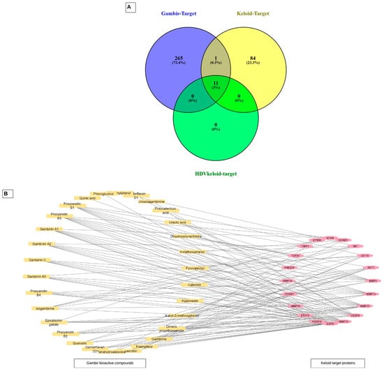(A) Intersection Venn diagram between the predicted target proteins of gambir bioactive compounds, keloid-related target proteins, and high degree of connection values of keloid-related target proteins. (B) Compound–target network of gambir bioactive compounds targeted to keloid disease.
