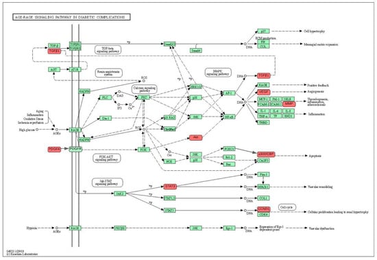 Pathway prediction of the target proteins using KEGG. The red nodes are potential target proteins of Uncaria gambir, while the green nodes are relevant targets in the pathway.