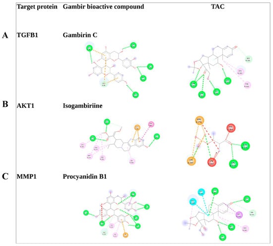 Three best molecular docking results: TGFB1 and Gambiriin C (A), AKT1 and Isogambirine (B), and MMP1 and ProcyanidinB1 (C).