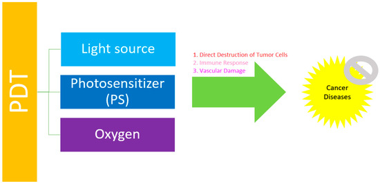 The PS can accumulate in cancer cells in the vascular system [23]. When PS is activated by the appropriate light, photodynamic action is induced. This affects the permeability of vascular walls, and platelets become aggregated and result in blood clotting [24]. Tumor regions lack blood supply and cause cell death of cancer cells [25]. This also releases toxic substances such as thromboxanes and toxic cytokines to activate the immune system [26].