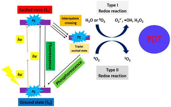 PDT combines three elements, including the use of a PS, light, and molecular oxygen (O2) [8]. Generally, a PS absorbs light producing the excited species and reacts with O2 to generate highly ROS. These ROS cause an imbalance of the redox state in tumor cells leading to cell death [9] (Figure 1). Actually, PS is irradiated with visible light of a suitable wavelength to absorb the energy from a ground state S0 to an excited state S1 (singlet). It involves “Type II Redox Reaction” and “Type I Redox Reaction”.