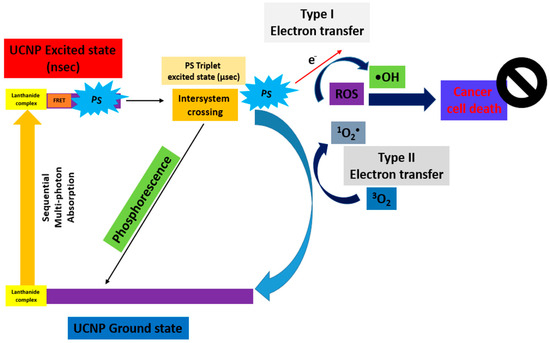 “Type II Redox Reaction” consists of the energy transfer, and uses the 3O2 in its ground state as the acceptor of energy forming 1O2. “Type I Redox Reaction” involves the formation of superoxide ions (O2−), free radicals (O2•−, •OH), and H2O2 from the water and 3O2. These mechanisms simultaneously occur, and the formation of ROS depends on the PS type and concentration, or oxygen [10]. This principle is further demonstrated in Figure 2 (TPE-PDT) [11] and Figure 3 (UCNP-PDT) [12].